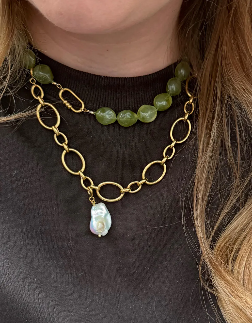 Die Halskette „Mystischer Wald“ ist handgefertigt aus wunderschönen moosgrünen Perlen in organischen Formen. Ein stimmungsvolles, natürliches Schmuckstück, das Ihrem Hals Ruhe, Charme und einen Hauch von Naturmagie verleiht.